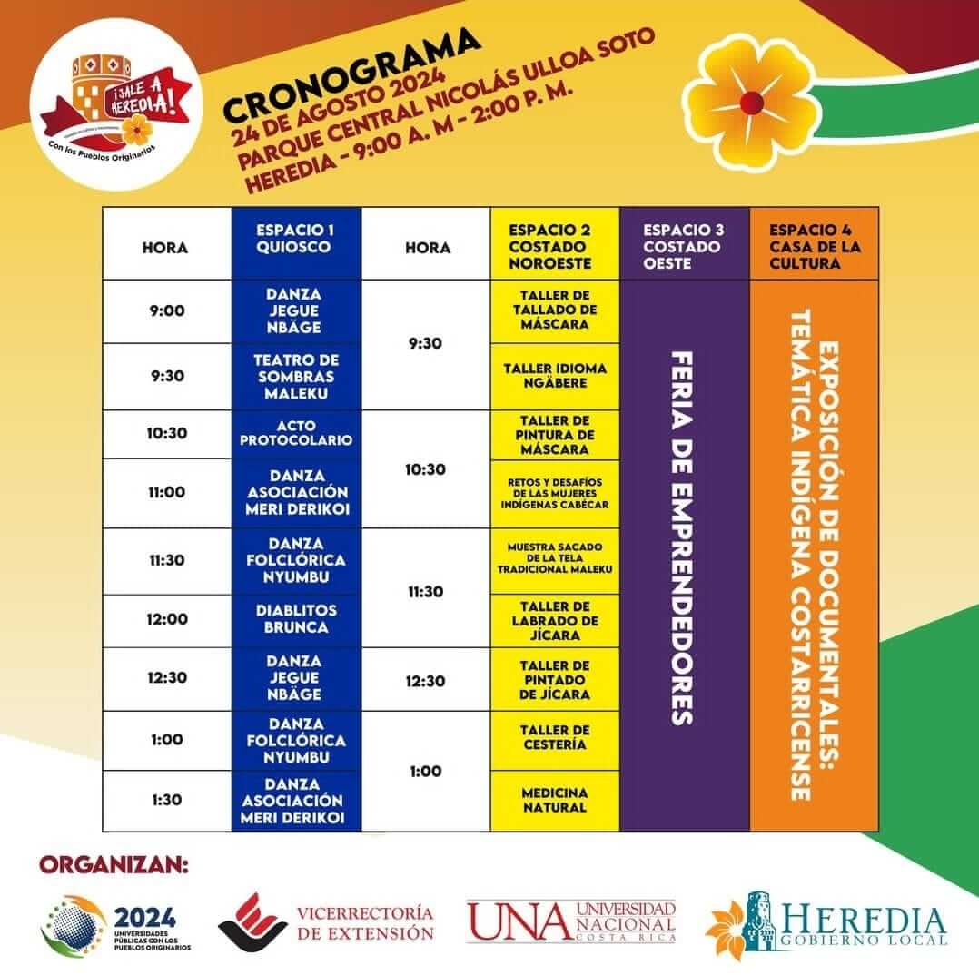 La Rectoría, el programa UNA-Vinculación y la Vicerrectoría de Extensión de la Universidad Nacional (UNA), en colaboración con la Municipalidad de Heredia, tienen el gusto de invitar a la comunidad herediana y público en general a disfrutar del Festival de Pueblos Originarios UNA-2024, el cual se desarrollará este sábado, 24 de agosto de 2024, en la Casa de la Cultura Alfredo González Flores, en horario de 9:00 am a 11:30 am.