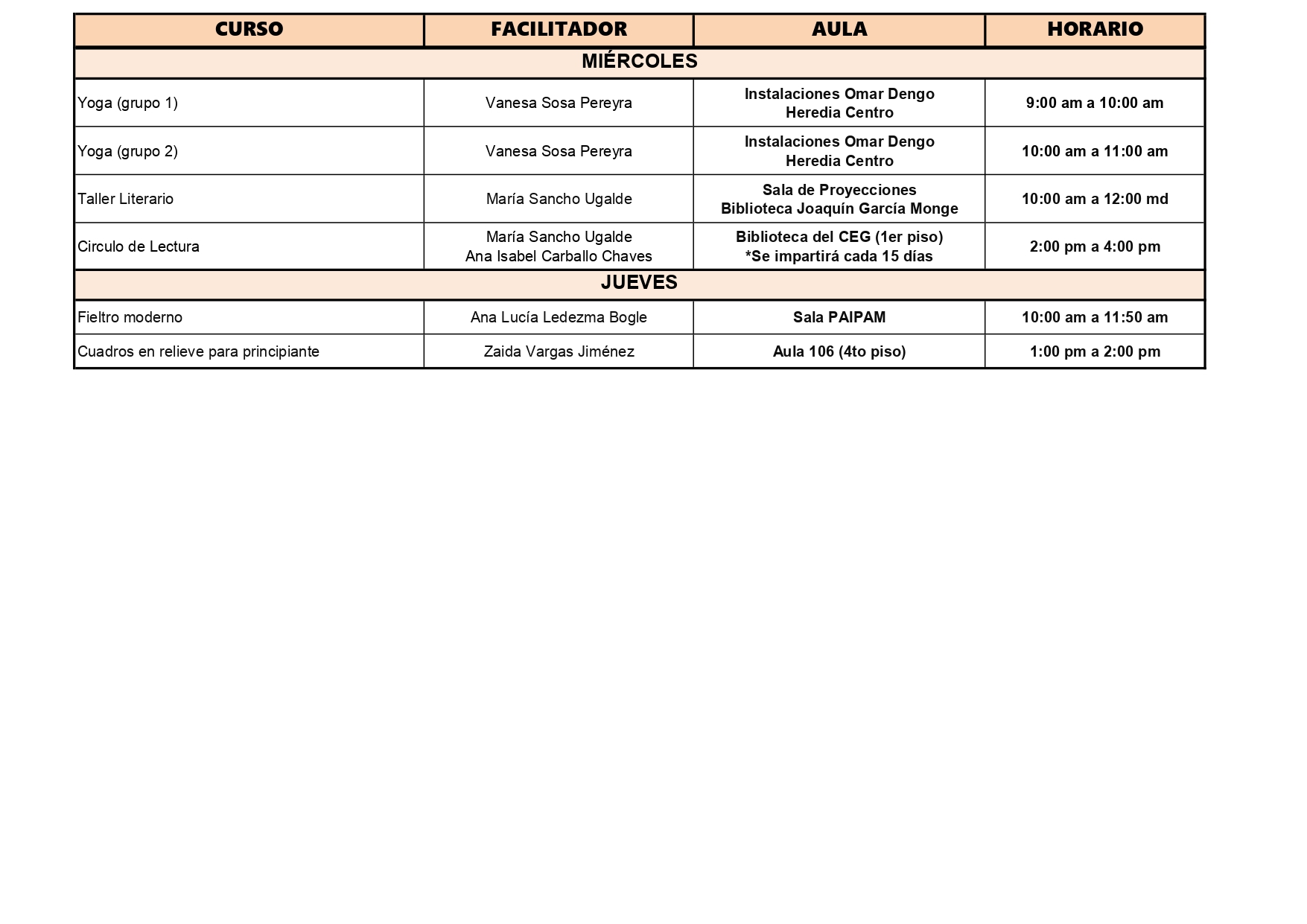 El detalle completo de los cursos y horarios, se detallan a continuación: