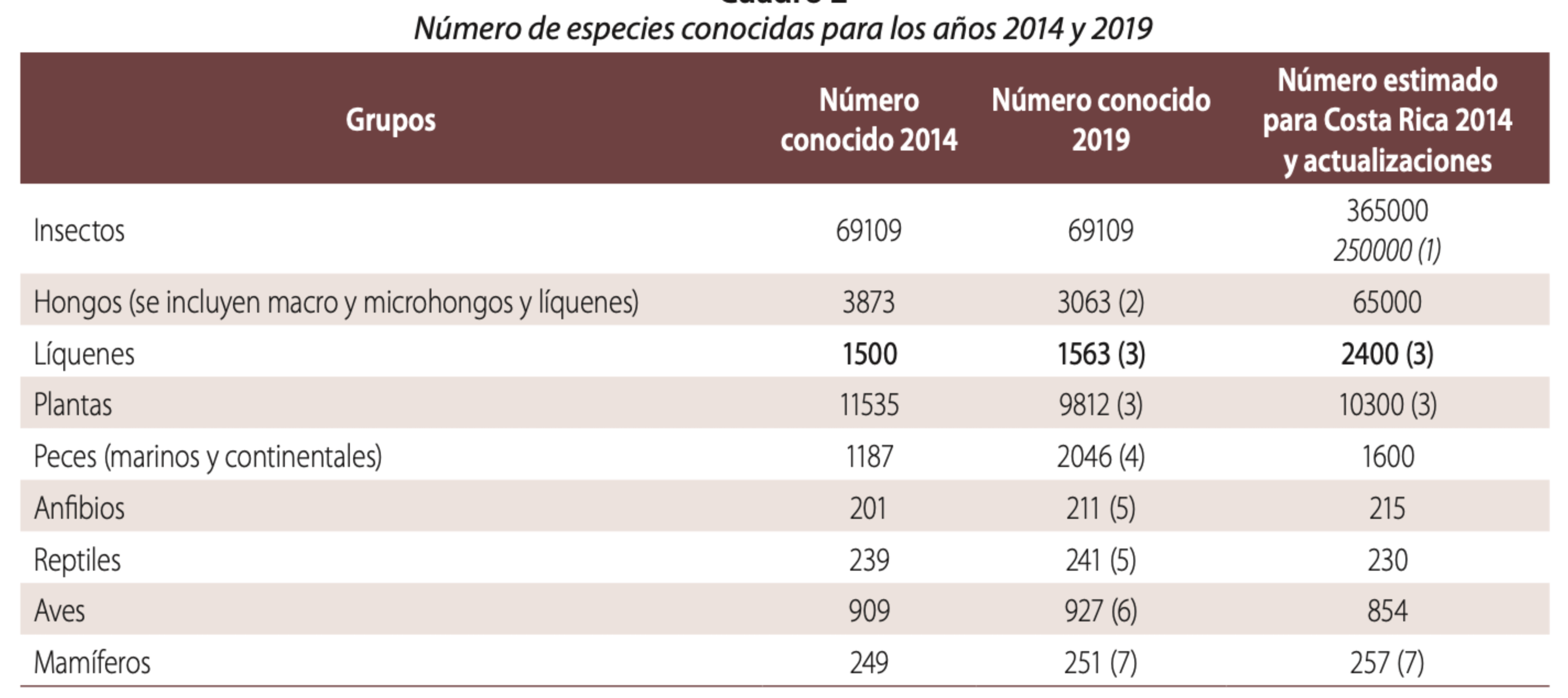 Para 1992, el número de especies esperado para el país se calculó en aproximadamente 500 000; el 71% se concentra en insectos, cita el artículo. Hoy día este número podría al menos duplicarse, “máxime con las nuevas técnicas de identificación mediante el empleo de ADN, en las cuales el país ya ha incursionado”, refieren las autoras.